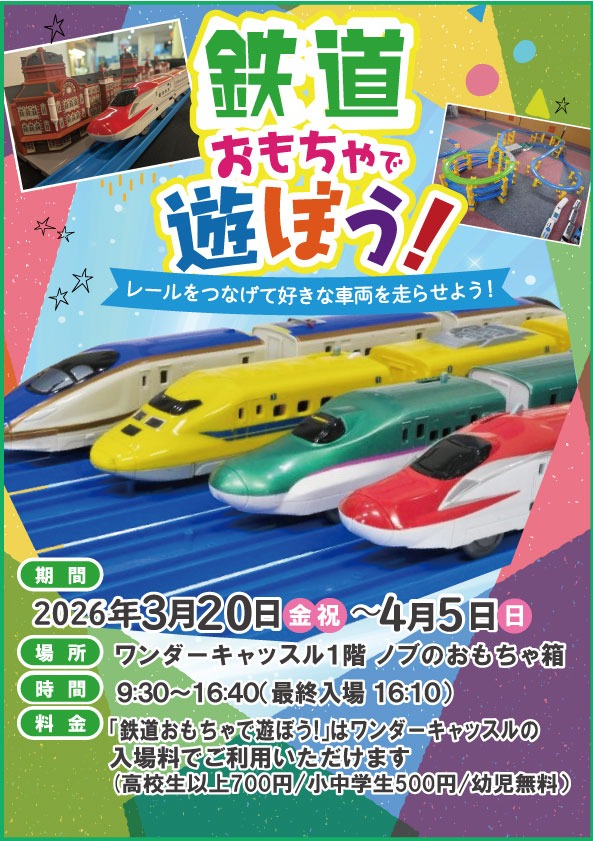 「鉄道おもちゃで遊ぼう!」はワンダーキャッスルの入場料でご利用いただけます 高校生以上/700円 小中学生/500円 幼児/無料 |